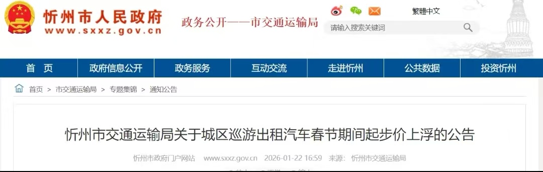 忻州市交通运输局 关于城区巡游出租汽车春节期间 起步价上浮的公告